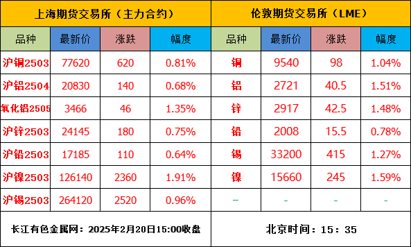 【美中贸易或达成新协议,内盘金属普涨】 宏观消息概览: 美国方面,1月新屋开工数下降9.8%至137万套,低于经济学家预估。美联储会议纪要显示,官员们准备在通胀顽固和政策不确定时保持利率不变,市场预计3月维持利率不变的概率高达97.5%。此外,美国总统特朗普表示可能与中国达成新贸易协议,避免贸易战。 国内方面,2月20日,国务院举行政策吹风会,商务部等四部门介绍扩大高水平对外开放和稳外资工作有关情况。 基础金属分析: 今日,内盘金属市场全线飘红,整体市场氛围表现偏暖。 1、铜价上行幅度有限,期价重心止步于7.8万下方。市场实货成交平淡,交易动能不足。宏观仍受特朗普关税政策不确定性和美联储降息态度影响,但国内产业政策乐观及及基本面供应短缺支撑,铜价涨势仍可期。 2、铝价受美中贸易协议乐观预期和欧盟制裁俄铝进口提振攀升,但终端消费不佳限制涨幅。 3、锌价持稳,锡价受宏观利好提振,需求复苏显著,尤其是电子和新能源领域,预计高位运行。 4、铅价微跌,受俄乌谈判预期利空及特朗普关税政策影响,市场避险情绪升温。现货市场成交疲软,持货商挺价无果,需求乏力。 5、锡价受宏观利好支撑,商品市场反弹。供应宽松,但电子和新能源领域需求强劲,支撑锡价高位运行。现货市场观望情绪浓,预计锡价维持高位。 6、镍价同样受宏观利好支撑,供应端趋紧,需求端增长,预计偏强运行。 展望明日,金属市场或延续高位震荡格局。投资者需继续关注宏观面政策变化,尤其是特朗普关税政策动态和美联储降息预期,以及供需基本面情况,如供应短缺是否加剧、终端消费能否改善等,以做出合理投资决策。 新浪合作大平台期货开户 安全快捷有保障
